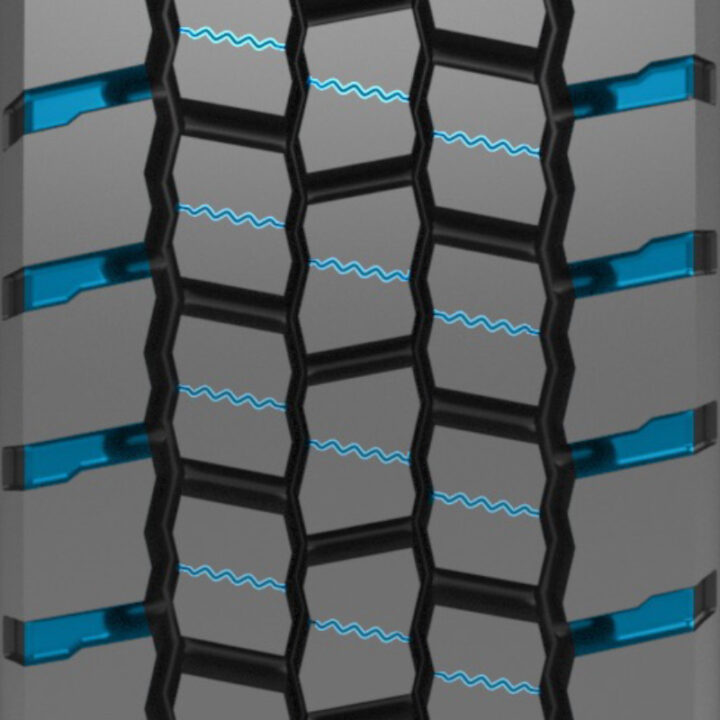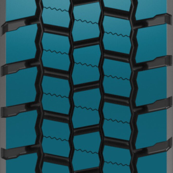 A drive axle tire for regional applications. The enhanced block type tread design features an optimized footprint, which contributes to improved traction, increased mileage, and a reduction in irregular wear. The incorporation of 3D sipes and open shoulder lugs ensures excellent traction and facilitates quicker water evacuation across various road conditions. Additionally, the reinforced casing enhances the tire’s durability and retreadability.