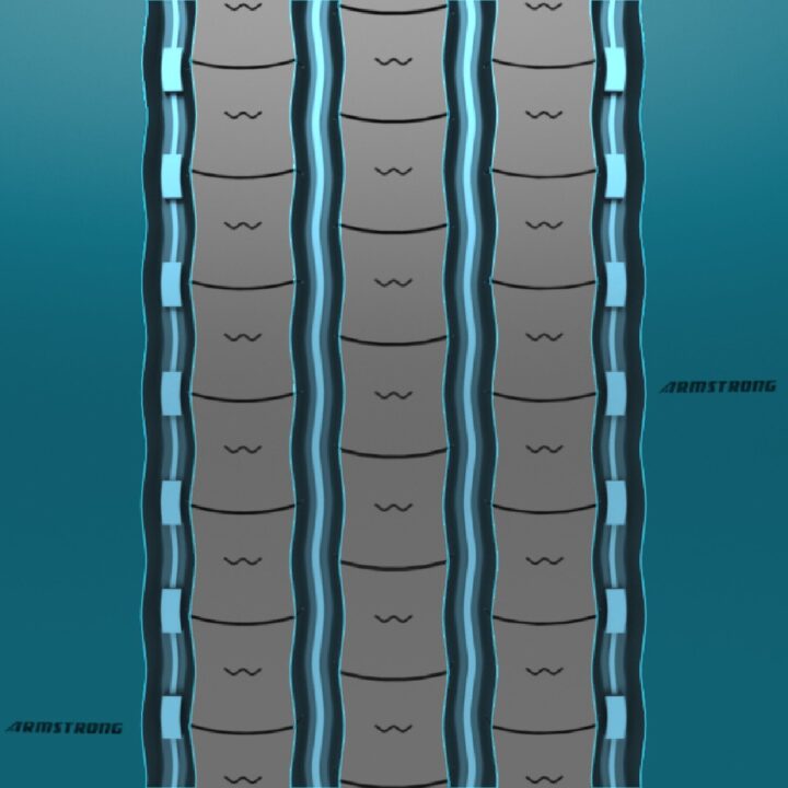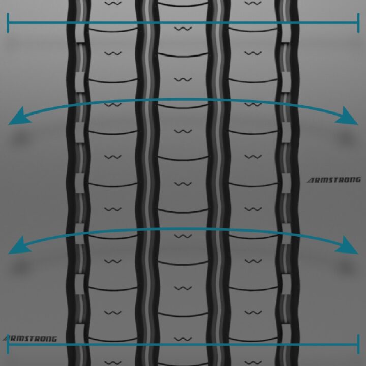 Next generation steer pattern designed for regional applications with a wide tread pattern for exceptional grip across all road conditions, a low hysteresis compound that leads to low rolling resistance, solid shoulder ribs for increased handling, and innovative outer grooves for enhanced casing life.
